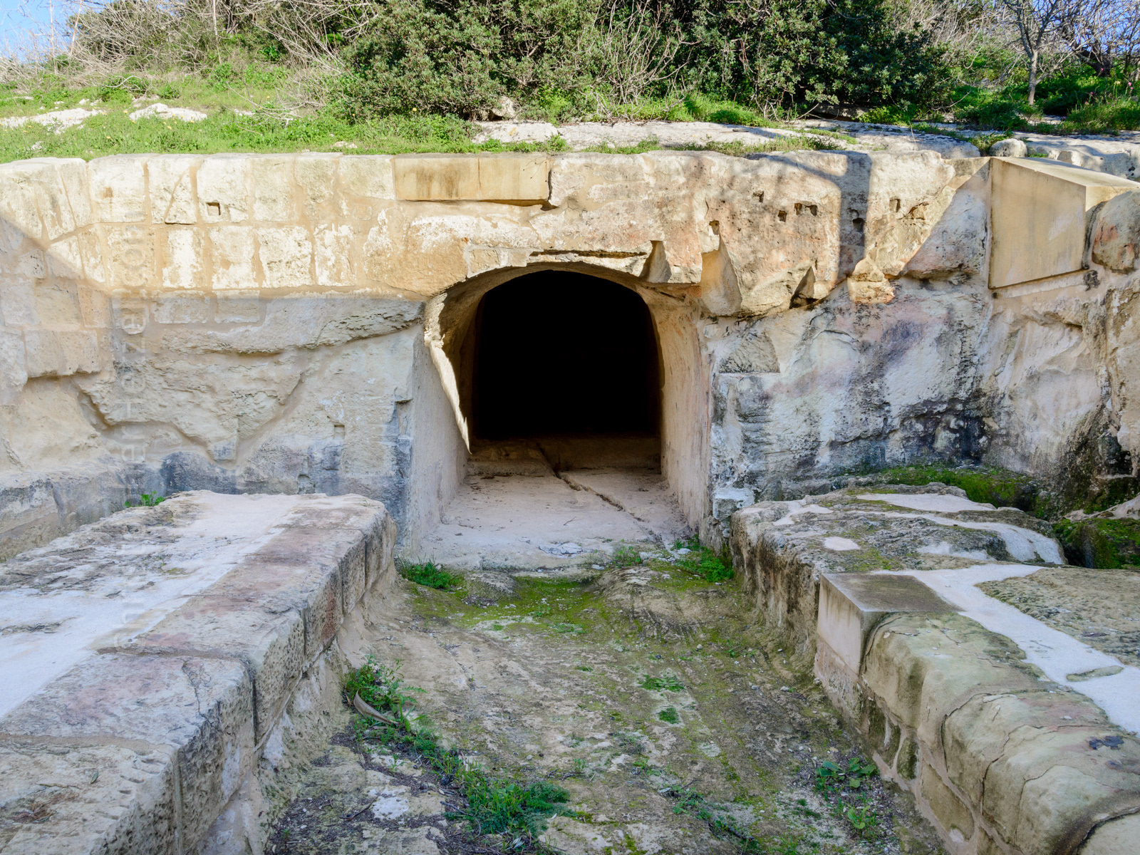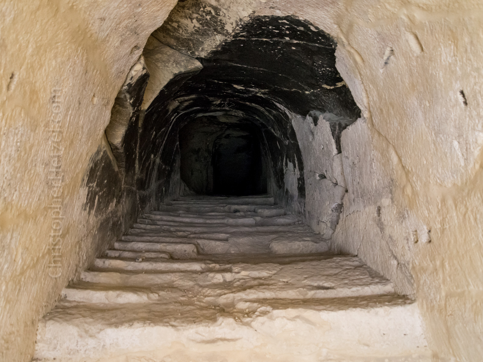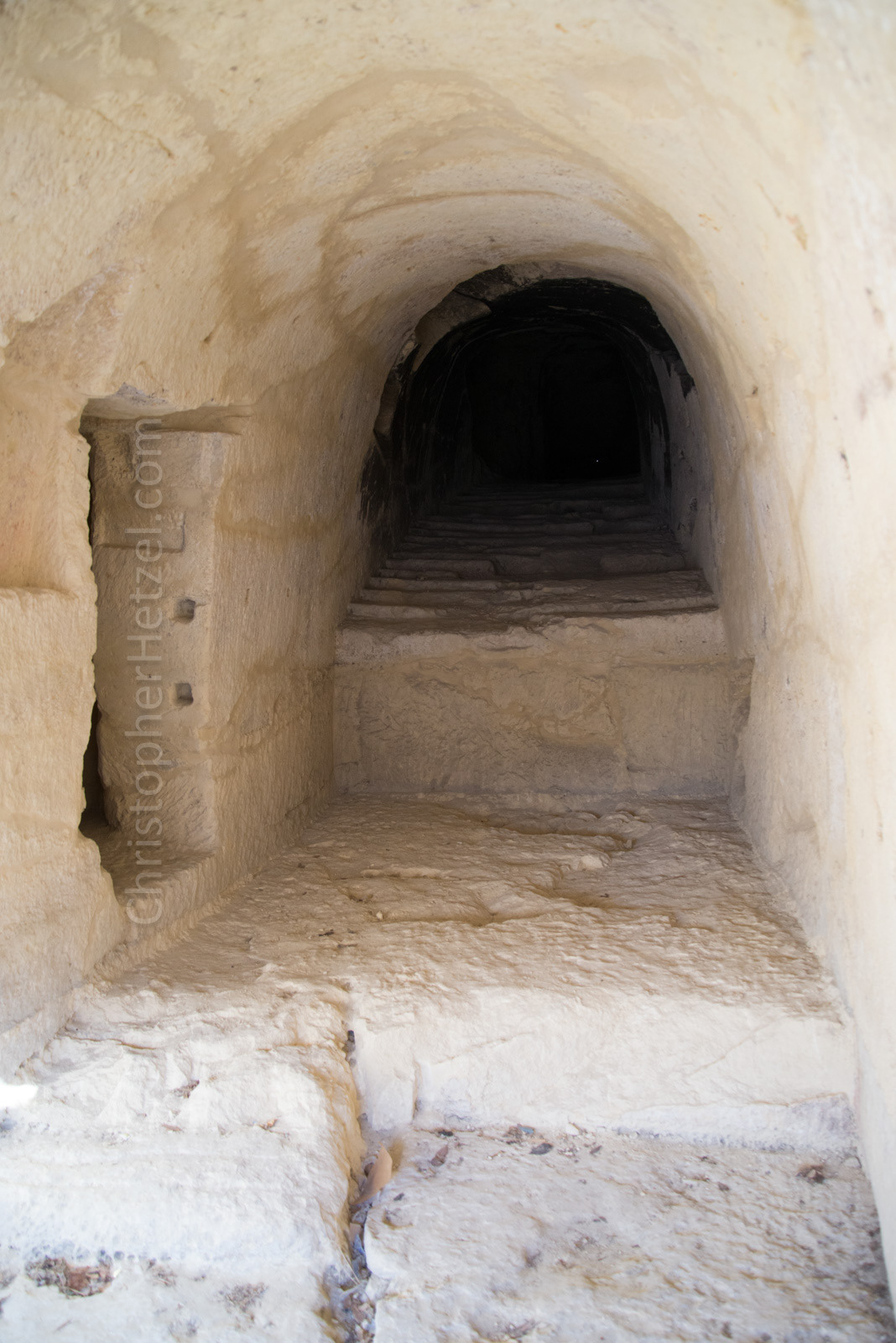An abandoned sally port through the medieval walls of Valletta, Malta, complete with traffic worn steps, a guard room, and a smoke stained ceiling.